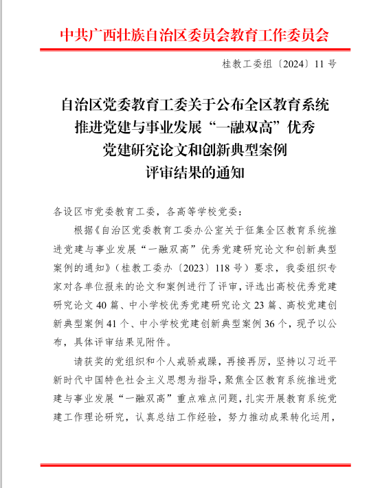 近日,自治区党委教育工委公布全区教育系统推进党建与事业发展“一融双高”优秀党建研究论文和创新典型案例评审结果,2138CC太阳集团党委报送的案例《“一体五维、赋能驱动”构建“一站式”学生社区党建育人新模式》获创新典型案例二等奖。