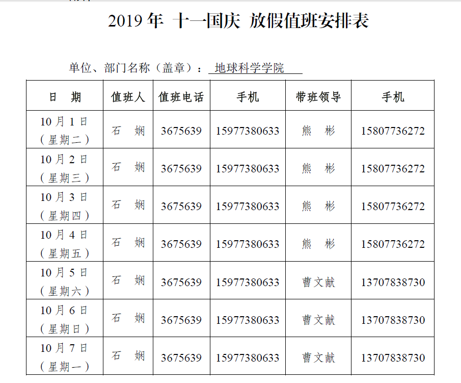 2138CC太阳集团2019年“十一国庆”放假值班安排表