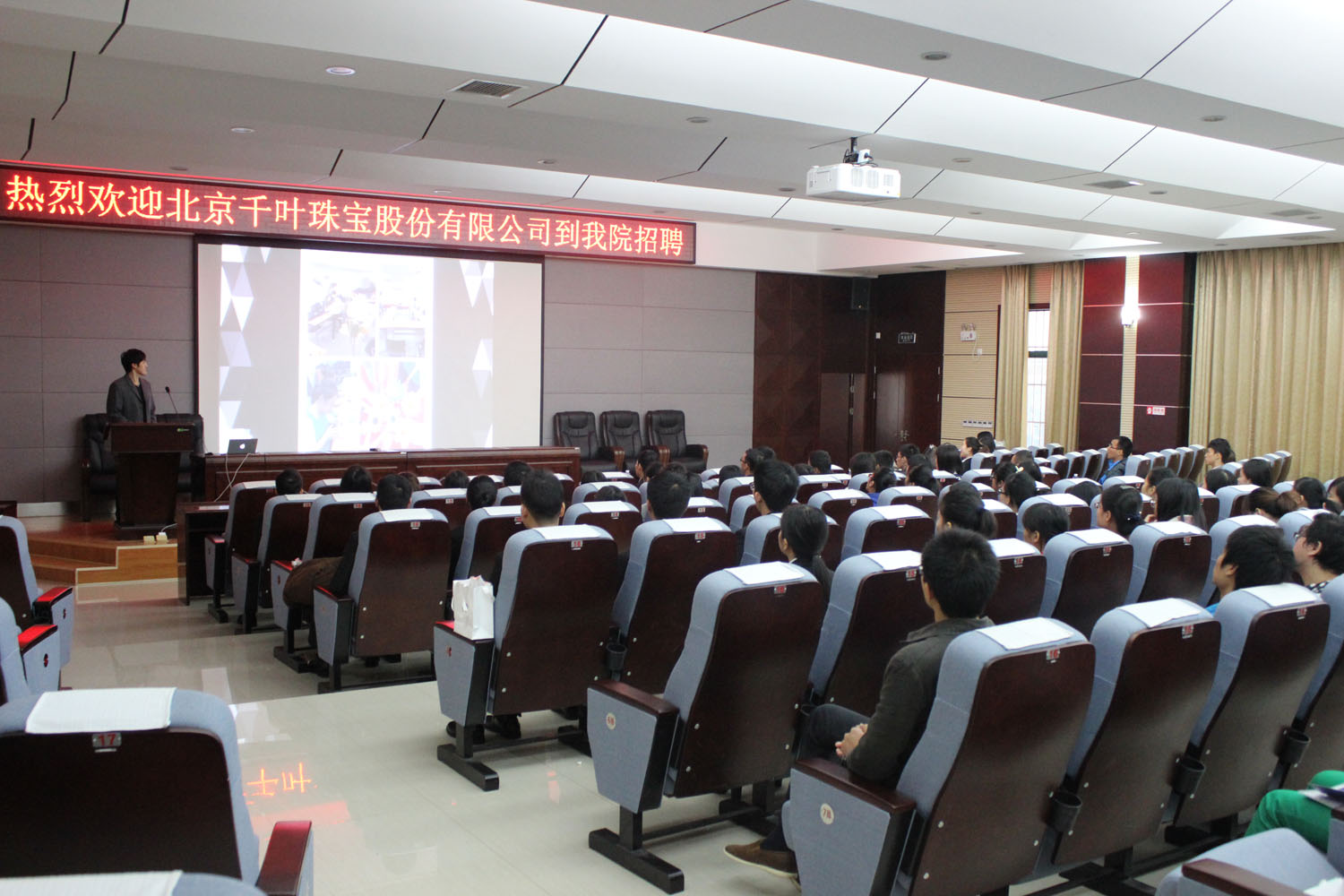 2015年7月4日,北京市千叶珠宝股份有限公司人力资源中心总监邱尔芃一行7人到2138CC太阳集团招聘宣讲会,学院党委副书记耿俊茂老师、宝石教研室主任雷威老师,2012级辅导员谷正杰老师以及2012级、2013级宝石专业学生120余人参加了宣讲会。
