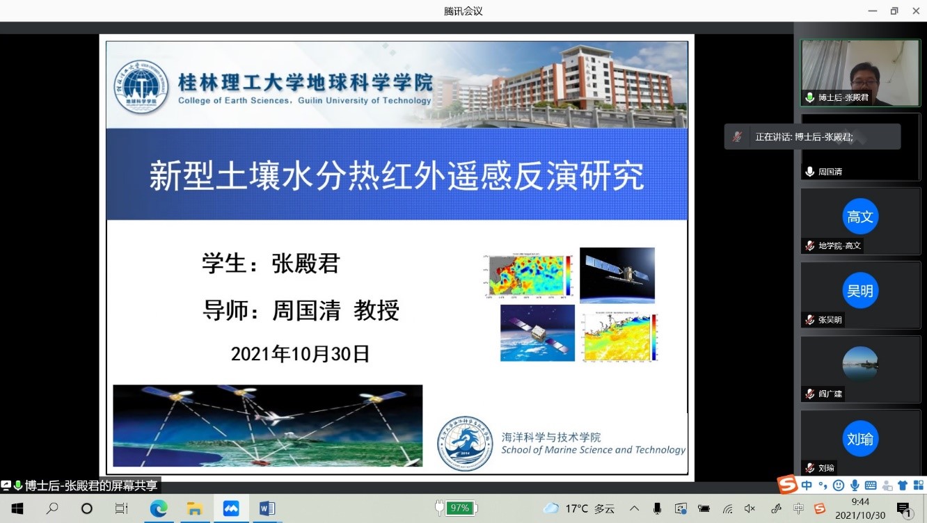 答辩过程中,张殿君博士从研究意义、存在的问题、主要研究内容、模型应用与验证以及总结与展望五个方面对自己的主要研究内容“新型土壤水分热红外遥感反演研究”进行了汇报。汇报结束后,五位专家对张殿君博士在站期间的研究成果以及此次工作报告表示了高度认可,并提出了一些具有建设性的意见和建议。最后经过答辩组专家集体评议、表决,一致认为张殿君博士达到博士后出站要求,同意出站。