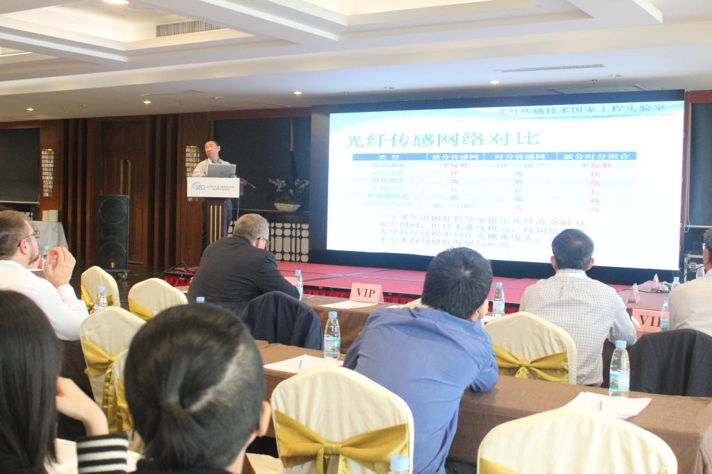 接下来是为期两天的技术交流,分为井孔地震(Borehole Seismic)、微地震监控(Microseismic Monitoring)、测井与岩石物理(Logging and Rock Physics)、井孔地球物理前沿创新技术(Leading-edge Technology on Borehole Geophysics)等四个专题单元依次进行。来自中石油东方地球物理公司、中石油大庆油田、中石化胜利油田、中石油测井公司、Baker Hughes-a GE Company公司、Halliburton公司、Seismik s.r.o公司、中国石油大学、中国矿业大学、成都理工大学、电子科技大学、中国科学技术大学、北京大学、哈尔滨工业大学、河海大学、华中科技大学、上海交通大学、新加坡国立大学、2138CC太阳集团、中科院声学所、中科院半导体所等中外知名企业、高校和科研机构的30余位专家学者做了报告分享。同一个会场,理论与实践经验并重,从不同层面共同推进并升华了会议的主旨议题。