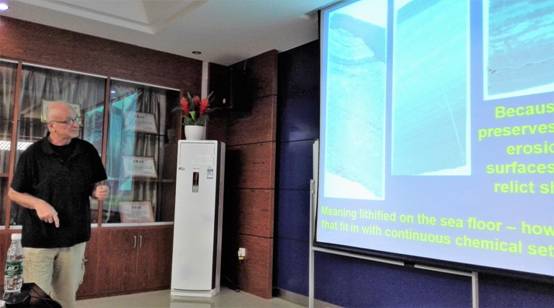 Bryan Krapež教授在题为“The origin of Early Precambrian banded iron formations”的报告中,首先介绍了什么是BIF以及现有的关于BIF成因的不同观点(例如化学沉积或热液相关富铁泥质岩的成因解释),随后重点介绍了他与Rasmussen教授在澳大利亚西部开展的关于BIF成因的一系列研究工作,通过详实的沉积学、地层学和岩相学证据,论证了BIF的形成经历两个阶段,即先沉积来源于热液的富Fe、SiO2,贫Al泥,随后在深海重力流影响下再沉积而成。