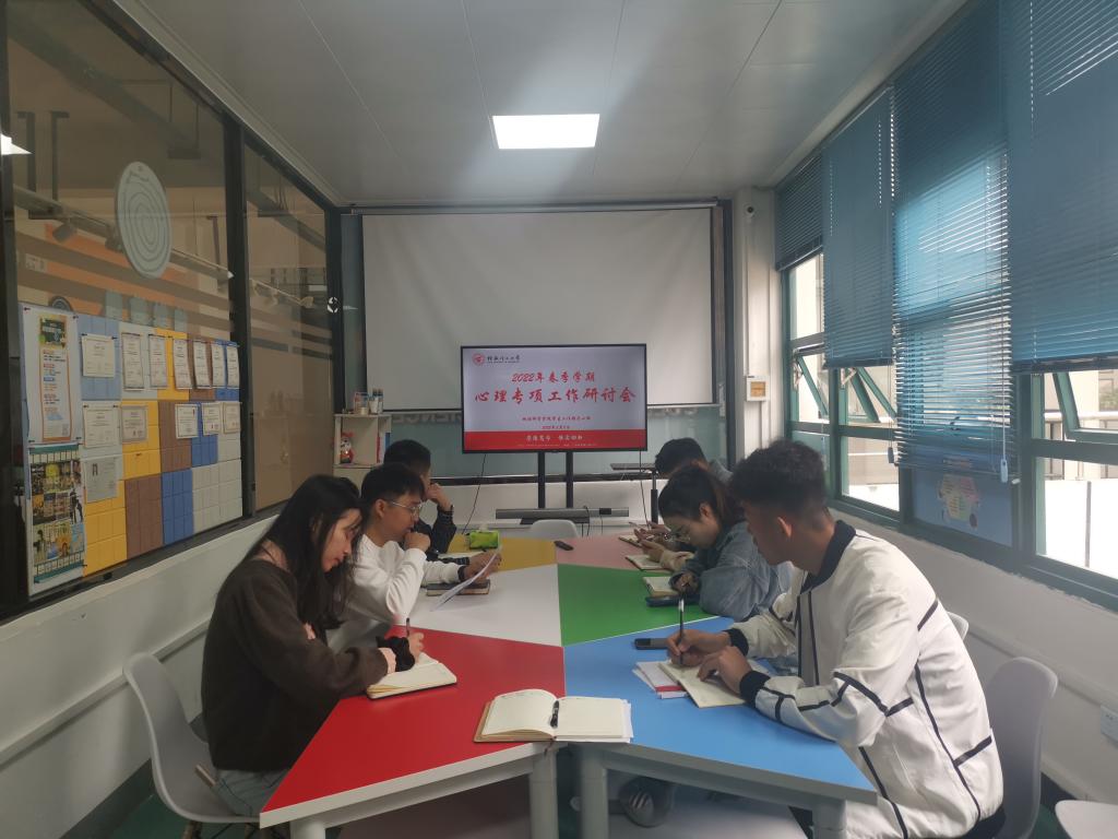 会议伊始,陈文甫老师对学院上学期心理工作进行总结,明确了心理健康教育工作的重要性,强调了心理健康工作对于学生工作的重要性。随后,林丽专老师对2022年春季学期心理健康工作规划和心理特色项目“你笑起来真好看”工作进度进行了汇报。会议的最后, 各年级辅导员对本年级出现的典型心理案例进行报告,研讨会现场展开了热烈的讨论,大家纷纷就案例发表个人经验做法,最终凝练出具有可行性和参考意义的解决方案。