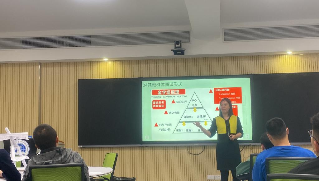 针对当下就业严峻态势,陶剑飞根据目前总体就业情况和行业发展情况,重点分析了个体面试常见题型与技巧和群体面试与领导力提升。并结合生动详实的视频案例,采用情景重现、面试纠错等方式,深入浅出地给在场学生介绍了面试方法、面试技巧等实用求职面试技能。在互动交流中,陶剑飞细致耐心地为同学们答疑解惑,强调“面试是一场精心准备的考试”,毕业生求职者一定要精心准备,现场气氛非常活跃。