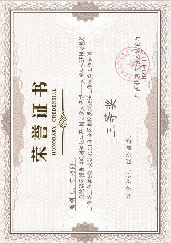 为深入贯彻落实全国全区高校思想政治工作会议精神和学校思想政治理论课教师座谈会精神,进一步加强高校思想政治工作,2021年下半年,自治区教育厅组织开展了全区高校思想政治工作优秀调研报告和工作案例征集评选活动。2138CC太阳集团的《规划学业生涯树立远大理想——大学生生涯规划教练工作坊工作案例》荣获2021年全区高校思想政治工作优秀工作案例三等奖。