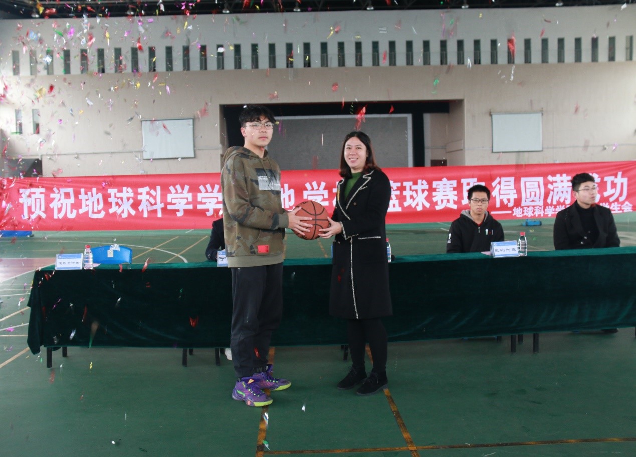 开幕式中,陶剑飞老师引用邵逸夫、李嘉诚等名人的例子,为我们阐明了虽然我们现在不能像他们一样富有,但是我们可以像他们一样地热爱运动的道理,并激励我们要保持良好的运动习惯。并提出了运动员要秉持友谊第一、比赛第二的原则进行竞赛,在运动过程中要注意安全。之后,运动员代表及裁判员代表先后进行宣誓,他们都表示,他们会秉持公平公正的原则进行参赛。最后,“地学杯”篮球赛开幕式在陶书记为运动员代表授球中圆满结束。