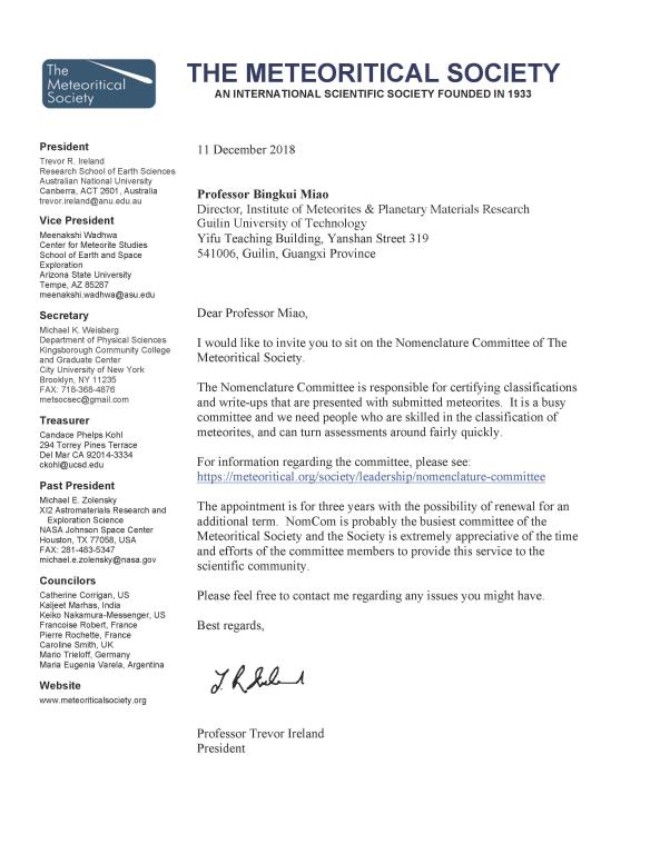 近日获悉,我校缪秉魁教授应邀担任国际陨石协会陨石分类委员会委员,主要负责国际上陨石申报的审查和陨石确认工作。该委员会共有9名成员,我国仅1人,至今,我国曾有欧阳自远院士等4名专家担任过此职位。
