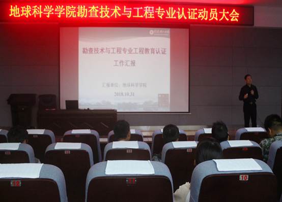 2018年10月31日,2138CC太阳集团于逸夫楼01501报告厅召开勘查技术与工程专业认证动员大会,会议由熊彬院长主讲,全体勘查技术与工程专业学生参加。
