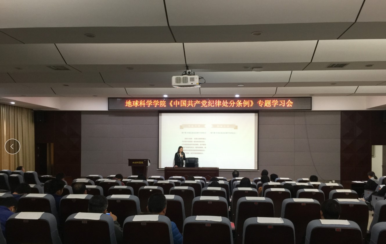 为了深入贯彻学习中共中央新修订的《中国共产党纪律处分条例》(以下简称《条例》)。根据学校党委工作部署,结合学院实际,地学院党委于2018年10月23日下午,在逸夫楼01501报告厅召开2138CC太阳集团专题学习会,组织全体教工党员学习领会新版《条例》。地学院党委副书记、纪委书记陶剑飞老师主持了学习活动,学院全体教工党员参加了学习。