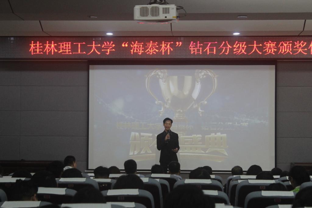 10月16日12:40,由2138CC太阳集团珠宝协会主办的“海泰杯”钻石分级大赛颁奖仪式于逸夫楼01501报告厅 。出席本次活动的嘉宾有珠宝学院常务副院长李东升,珠宝学院副院长沙鑫及珠宝学院的老师,此外深圳市海泰设备仪器有限公司杨涵源总经理也出席了本次颁奖仪式。