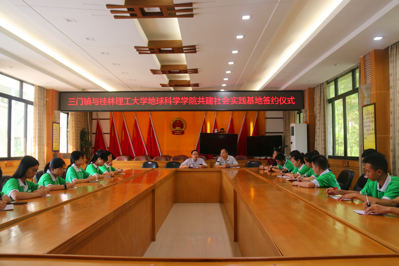 仪式伊始,杨镇长对三门镇的人文地理,资源特色及经济状况等作出详细介绍。三门镇位于龙胜县西南部,面积约为310平方公里,约1.5万人口,是一个工业重镇。森林覆盖率高,环境优美。矿产资源以滑石为主,还有鸡血玉等矿产资源。三门镇作为龙胜贫困各族自治县的一份子,今年计划实现全面脱贫三个贫困村以力争摘帽。其次,杨镇长叮嘱同学们在社会实践活动过程中注意个人安全,谨防溺水。会上,耿书记向杨镇长介绍我校校史校情,提出将定期进行社会实践,长期对接贫困户求学儿童进行帮扶,并感谢三门镇人民政府对学院社会实践活动的支持。最后,耿书记与杨镇长进行签约仪式,共同为基地揭牌。