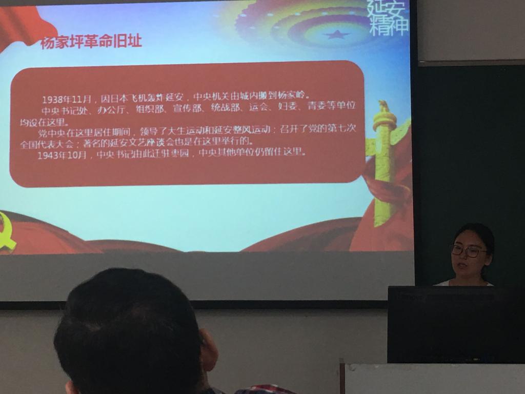 其次,代俊鸽老师分享以“延安精神—继承和发扬延安精神,重温红色岁月”为主题的我校2018年师德师风教育培训班学习心得。用文字和图片的形式依次介绍了杨家岭、枣园、王家坪三处中共中央的革命旧址,分享了在延安革命纪念馆和延安知青馆的所见所闻,详细介绍了梁家河村的发展历史及习近平总书记的七年知青岁月。