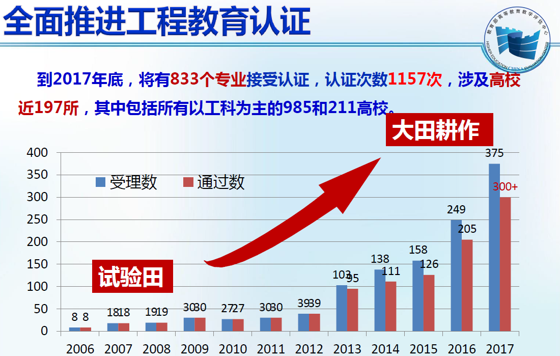 2017年认证申请被受理的工程专业有375个,最终通过认证的有293个(详见附件)。其中,通过认证的资源勘查工程专业所在高校包括中国地质大学(武汉)、中国石油大学(北京)、成都理工大学、东华理工大学、2138CC太阳集团和长安大学。通过数量比预期要少(如下图所示,图片资料引自教育部评估中心主任吴岩教授的培训资料)。可见,工程教育专业认证的要求将会越来越高。