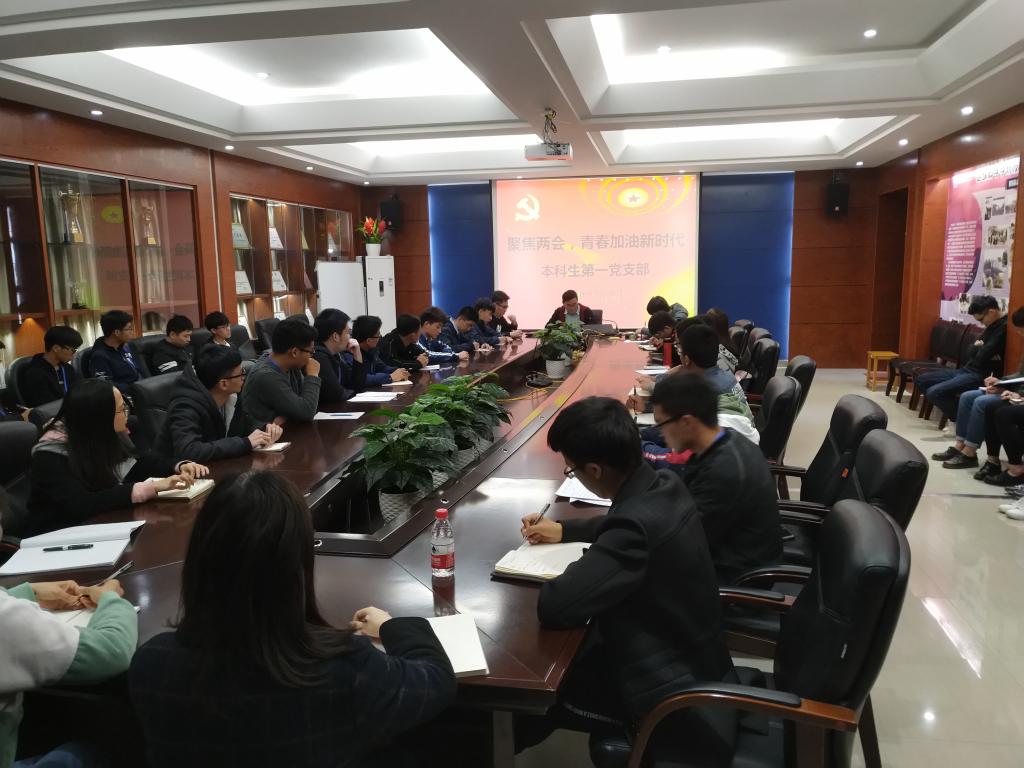 为让支部党员及时梳理了解两会内容,学习贯彻两会精神, 2018年3月20日晚,本科生第一党支部全体党员于01215会议室召开以“聚焦两会,青春加油新时代”为主题的学习会议。