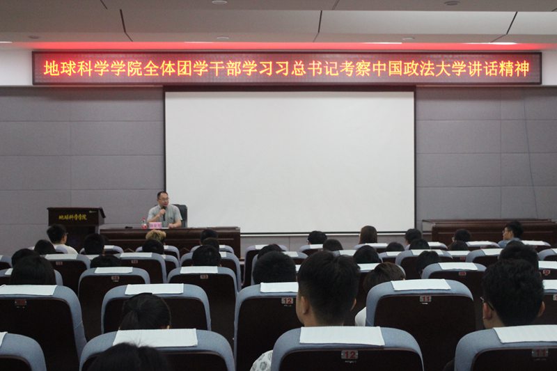 5月8日中午,地学院全体团学干部在逸夫楼01501报告厅集体学习习近平总书记考察中国政法大学讲话精神,学院党委副书记耿俊茂老师出席并讲话。会上,大家在观看新闻报道视频后,耿书记深入解读了习近平总书记讲话精神,希望同学们听党话、跟党走,坚定“中国的未来属于青年,中华民族的未来也属于青年”的光荣感与使命感。100多位团学干部结合自身,在讨论中从不同角度分享了对习近平总书记重要讲话精神的体会,坚定初心跟党走,勇担历史使命,树立奋发有为的远大理想。