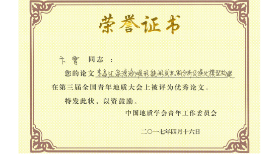 据悉,第一届全国青年地质大会于2013年在福州举行,大会共收到学术论文570余篇,420多名青年地质工作者参会,200多名代表做专题交流发言,评选出20篇优秀论文,我校两名研究生获奖;第二届全国青年地质大会于2015年在成都举行,大会论文摘要集共收入472篇论文,500余名青年地质工作者到会,200余名代表作了学术报告,共评选出优秀论文40篇,2138CC太阳集团本科生孙娟娟获奖。这次是2138CC太阳集团学子连续三届获奖,为学校赢得了赞誉。
