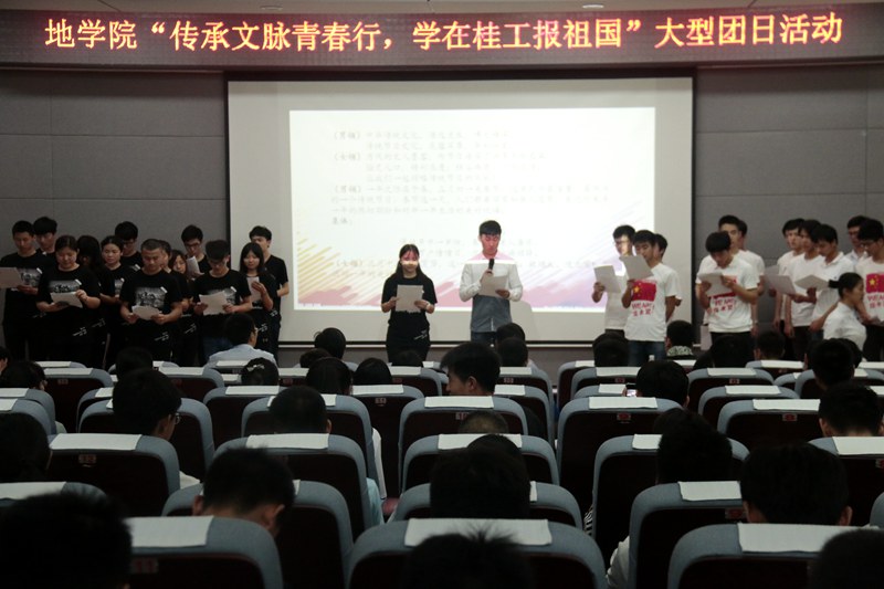 活动伊始,同学们观看关于传统文化的宣传视频,接着由资勘16实验班团支部与地质类16-3班团支部共同朗诵《歌颂传统》。在互动环节中,现场同学们积极参加,现场气氛达到高潮。随后播放一段习近平总书记关于“做合格共青团员,从学习传统文化开始”的主题视频,同学们在观看后踊跃阐述成为一名合格的共青团员基本要求,并如何将桂工精神付诸实际行动中。最后,耿书记在本次大型示范性团日活动总结中提到,希望大家学在桂工,传承发扬优秀传统文化,志在报国,发挥青春正能量。