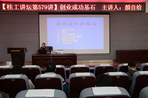 12月27日15:00,我校87级校友、桂林国达矿产勘探有限公司总经理颜自给在雁山校区逸夫楼01501报告厅进行题为“创业成功基石”的精彩讲座。此次讲座有200余名同学到场聆听。