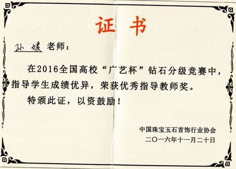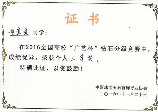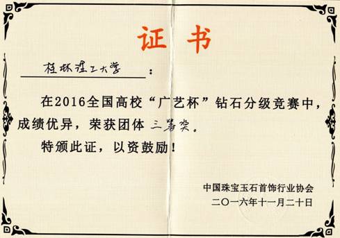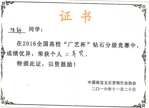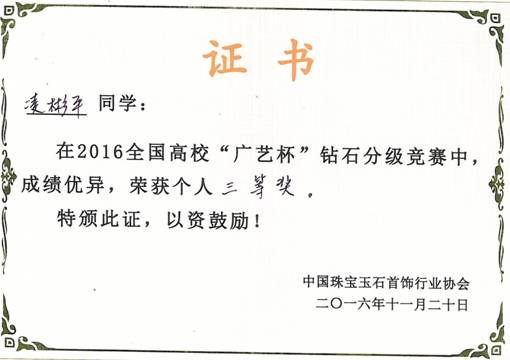 11月19日至20日,由中国珠宝玉石首饰行业协会主办,中宝协学术教育专业委员会和天津商业大学商学院共同承办的“2016全国高校‘广艺杯’钻石分级竞赛”完美落幕。来自全国31所本科、高职和中职院校的93名选手参加了本次大赛。大赛由中宝协学术教育专业委员会选聘高校和权威珠宝质检机构的专家,依据国家钻石分级标准(GB/T16554-2010)对选手提交的钻石分级报告进行评判。在决赛中,我校宝石专业的陈静、黄鸾爱和凌彬平同学凭借稳定的心理素质和过硬的专业技能,分别获得二等奖1项、三等奖2项,我校代表队获得团体三等奖,孙媛老师获得优秀指导教师称号。