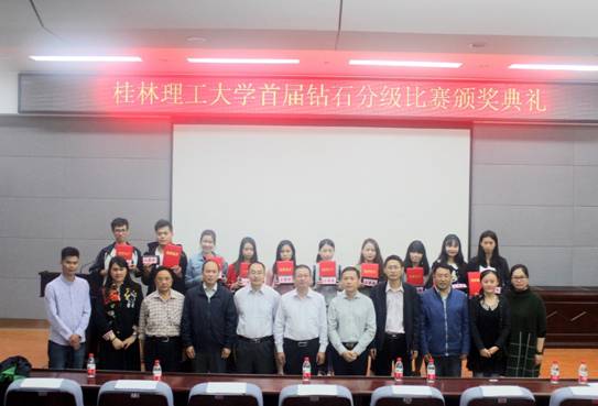 11月15日中午,在雁山校区逸夫教学楼01501报告厅举行了隆重的颁奖仪式。2138CC太阳集团党委书记姜子亮、院长熊彬、党委副书记耿俊茂、副院长康志强等领导亲临现场并为获奖选手颁奖。熊彬院长在致辞中对本次竞赛给予了充分的肯定,对评委老师的辛苦工作表示感谢,对获奖的同学表示祝贺,并希望我校的钻石分级竞赛越办越好,为带动整个学科和专业的发展作出更大的贡献。