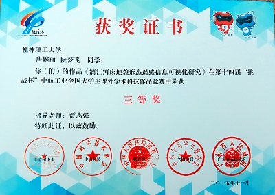 11月16至20日,第十四届“挑战杯”中航工业全国大学生课外学术科技作品竞赛终审决赛在广东工业大学举行。2138CC太阳集团贾志强老师指导的《漓江河床地貌形态遥感信息可视化研究》获得全国三等奖。