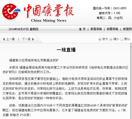 《中国矿业报》对地球电化学勘查法在福建的应用进行报道