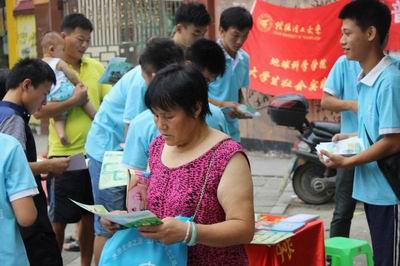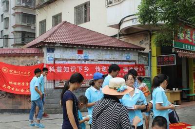 7月15日上午,2138CC太阳集团大学生社会实践团在学院团委书记蒋琼老师和辅导员莫长庆老师的带领下于桂林市灵川八里街中心广场展开科普知识宣传的工作。其中包括防震知识小百科,艾滋、结核等疾病的预防、以及基本的农田水土保持法以及水道管理条例等。