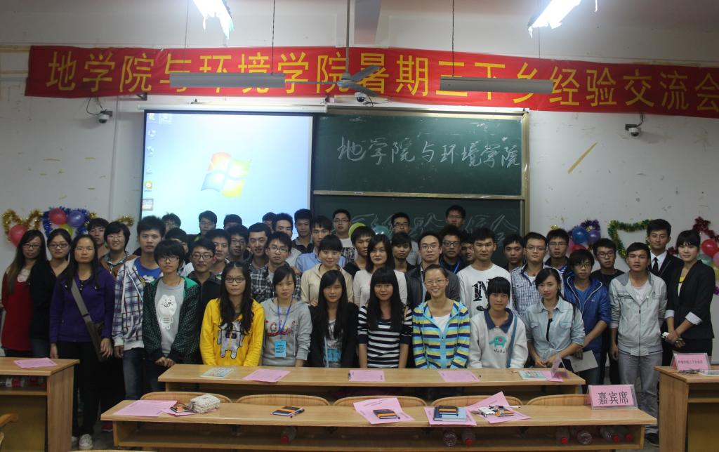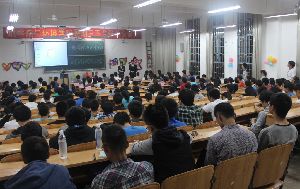 2013年11月2日晚7:30,地学院、环境学院三下乡交流会在雁山校区06408教室举行。2138CC太阳集团团委书记蒋琼老师、环境学院唐红兵老师出席本次会议,并致辞。