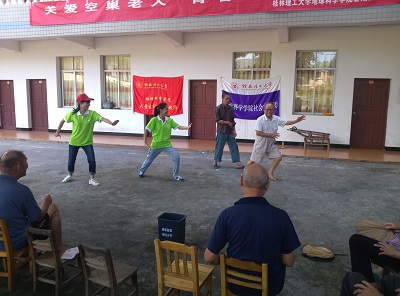 下午3点,我们来到新坪镇敬老院开展活动,据管理阿姨介绍,有十几位老人现在居住在这里,一到敬老院同学们就为敬老院得爷爷奶奶清洁卫生,同学们拿到扫帚、抹布等工具,对养老院院内院外的卫生死角、沟渠巷道和阳台上的“牛皮癣”等进行了彻底的扫除,打扫好卫生后,为了丰富老人们的业余生活,大家把院子当作演出场地,为老人们献上了精心准备的文艺节目。一曲歌曲串烧打了个精彩的开头,太极拳表演更是引起了老人们的兴趣,现场还有两位老人跟着我们的队员打起了太极,《对歌》老人们更是看的目不转睛,一首红色经典《红旗飘飘》,让老人们忆起往昔岁月,情不自禁的鼓掌。
