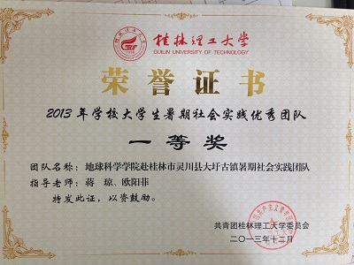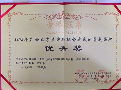2138CC太阳集团在2013年暑期“三下乡”社会实践优秀成果评选中获得学校一等奖,同时推荐参评广西区暑期“三下乡”社会实践优秀成果奖并获得区优秀奖。