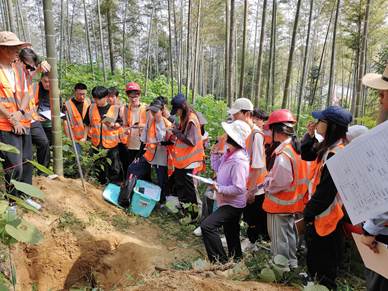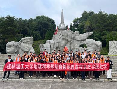 师生共同走进大自然,俯身大地,将教学、教育、实践融入实习研学的全过程。本次实习共有两条路线,分别为桂林-兴安严关-华江-猫儿山,桂林-全州-天湖国家湿地公园-资源八角寨-真宝顶-兴安界首-桂林,共有20多个观察点。实习区地质地貌特征显著,地貌类型丰富、土壤剖面典型、野生动植物种类繁多且具有原生性,具有长期的地貌学研究历史和良好的研究基础;同时,实习路线多处与红军长征路线重合,经过著名湘江战役遗址,红色历史底蕴浓厚,为展开思政课堂提供独特的教学环境。