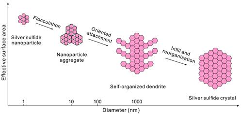 热液成矿过程中金属超常富集并形成高品位矿体是矿床学领域的一个重要科学问题。目前国内外关于成矿过程中银超常富集机理的认识非常薄弱,本项研究工作创新性地提出银硫化物纳米粒子自组织聚合,先后形成纳米粒子集合体和亚微米粒子、树枝状银硫化物,然后通过进一步充填和自组织形成具有晶体形态的银硫化物。外部环境的改变(如硫逸度、电场、温度等)可促使银硫化物向自然银转化,通过固态银离子聚合的方式形成发丝状自然银。上述有关银的富集机制解释了高品位银矿石的成因,得到国际同行专家高度认可。