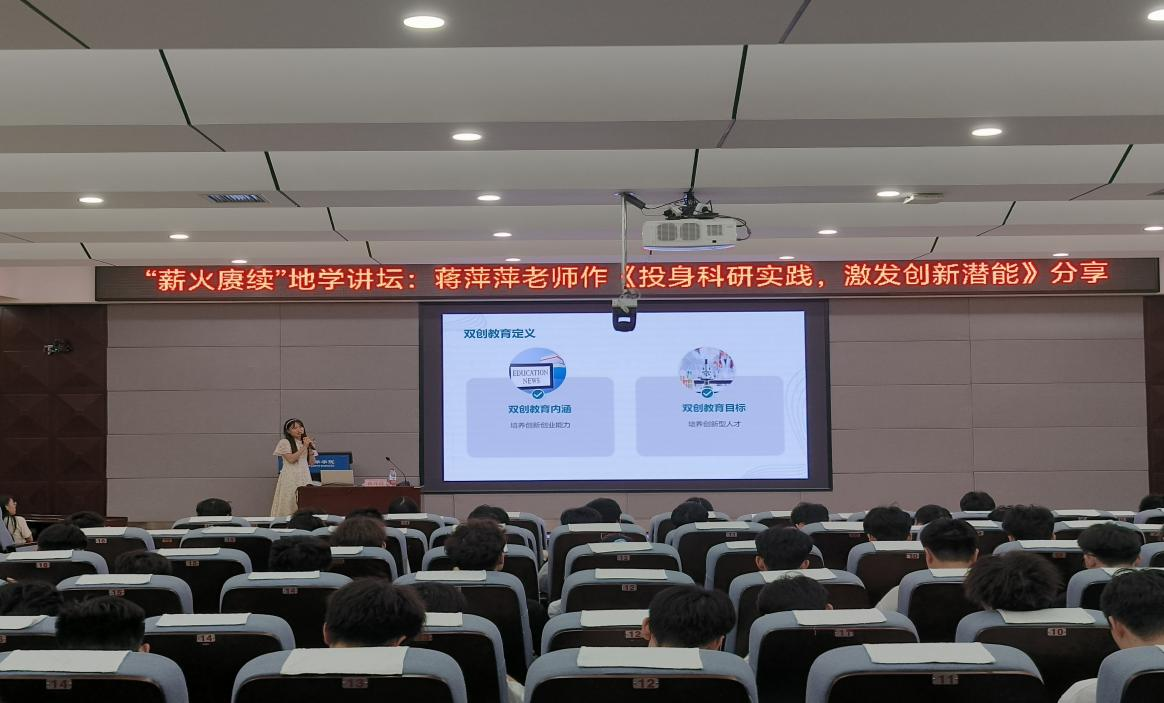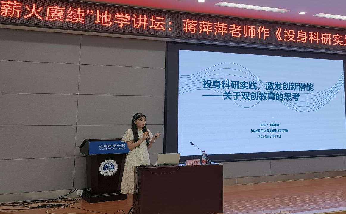 5月31日下午,2138CC太阳集团“薪火赓续”地学讲坛在01501报告厅如期举行。本次讲坛特邀了第九届中国国际互联网+大学生创新创业大赛“数广集团杯”广西赛区选拔赛优秀创新创业导师蒋萍萍博士,为大家带来了一场题为《投身科研实践,激发创新潜能——关于双创教育的思考》的讲座,学院200余名学生参加。蒋老师以其丰富的指导经验和独特的见解,为在场的同学们揭示了双创教育的深刻内涵与重要意义。