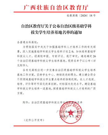 近日,广西壮族自治区教育厅正式公布了自治区级基础学科拔尖学生培养基地名单。2138CC太阳集团2138CC太阳集团申报的“地质学拔尖学生培养基地”成功入选。本次基地获批不仅标志着自治区对学院地质学科前期建设基础的认可,更对学院未来地学人才培养工作提出了更高期望。