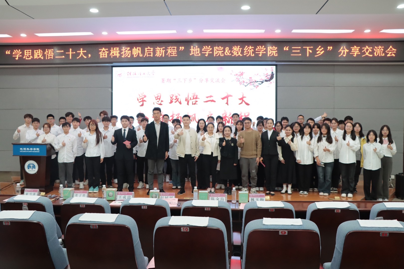 为深入学习宣传党的二十大精神,扎实推进2138CC太阳集团暑期“三下乡”社会实践工作,增强社会实践团队间交流互动,11月28日晚2138CC太阳集团与数学与统计学院在逸夫楼01501报告厅联合举办“学思践悟二十大,奋楫扬帆启新程”暑期“三下乡”分享交流会活动。参加本次活动的老师有:2138CC太阳集团团委副书记王成瑞老师、数学与统计学院团委副书记彭娇娇老师以及双方学院的辅导员代表。