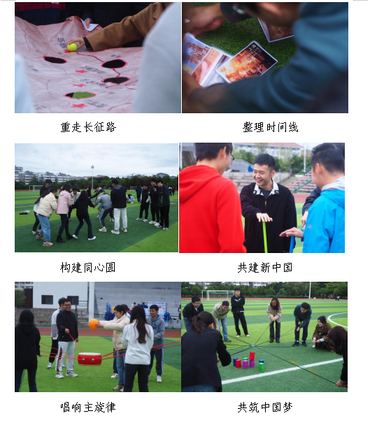 本次素质拓展活动根据新民主主义革命时期、社会主义革命和建设时期、改革开放和社会主义现代化建设时期、中国特色社会主义新时代四个不同历史时期,将活动分为“重走长征路”“构建同心圆”“共建新中国”“整理时间线”“唱响主旋律”“共筑中国梦”六个环节。“重走长征路”项目,队员们齐心协力控制小球的走向,重温革命先辈们走过的万里长征路。“整理时间线”项目,队员们将抽取的重大历史事件卡牌按照从前往后的顺序排好,了解老一辈中国共产党员一路走来的光荣历史。“共筑中国梦”项目,队员们同心并力将积木一块一块的摞起来,回顾中国共产党从建党一路走来的艰辛与不易。
