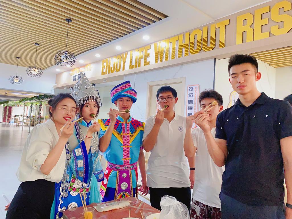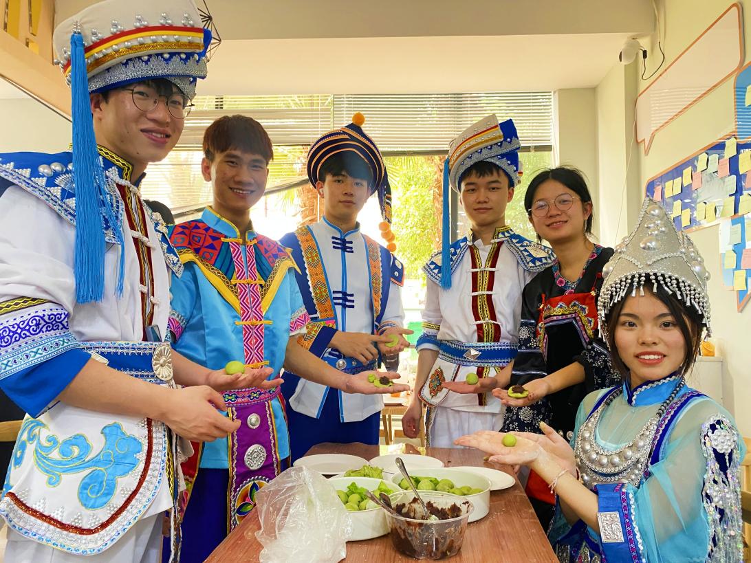 第二部分,做特色青团,在美食飘香中共话民族团结。青团是三月三节日里不可或缺的特色美食,在共享厨房内,同学们揉面、捏皮、准备豆沙馅,井然有序,其乐融融。此外,同学们还做起了水果茶、包起了饺子。虽然吃饺子不是三月三的传统习俗,但这是来自北方同学们对佳节来临的快乐心情。当各族师生围在一起吃青团、品饺子、喝果茶、聊民俗,传递出浓浓的民族团结情。