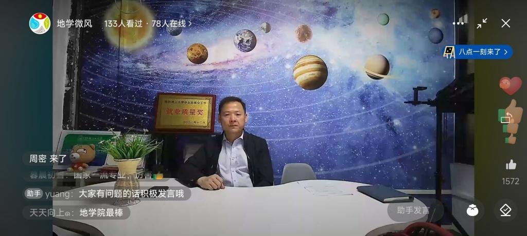 本次活动通过学院微信视频号“GUT地学微风”进行直播,共分为三个环节。首先,师生家长共同观看了2138CC太阳集团宣传片,初步了解了学院的发展概况。其次,熊彬院长向大家介绍了学院的专业特色、师资力量及建设情况,并对学院各个专业人才培养方案、考研和就业情况进行详细讲解。线上家长认真倾听,积极互动,熊彬院长和周密老师对家长们在弹幕中提出的问题进行了一一解答。