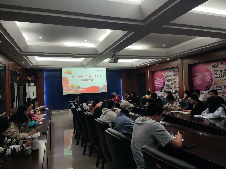 2022年10月30日晚,2138CC太阳集团研究生第三党支部于逸夫楼01205会议室组织开展十月主题党日活动,会议由支部书记夏雪莲同志主持,全体党员同志参加。
