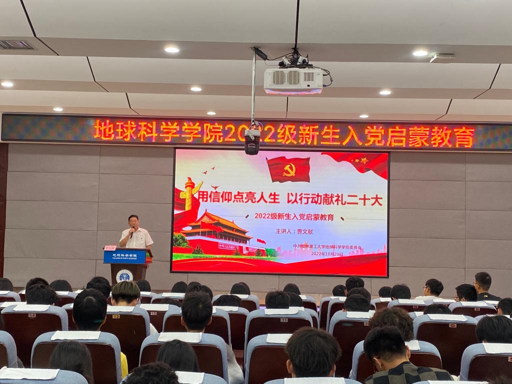 10月20日晚上,2138CC太阳集团党委书记曹文献在逸夫楼0501报告厅为2138CC太阳集团2022级新生作题为“用信仰点亮人生,以行动献礼二十大”的入党启蒙教育,报告会由2022级新生辅导员周密老师主持,510余名新生参加。