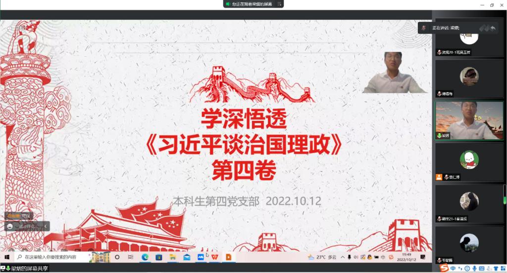 为深入学习贯彻习近平新时代中国特色社会主义思想,迎接党的二十大胜利召开,激励和引导全体学生党员坚定理想信念、践行初心使命,10月12日晚,本科生第四党支部在线上组织集中学习《习近平谈治国理政》第四卷,本次会议由梁熠同志主持。