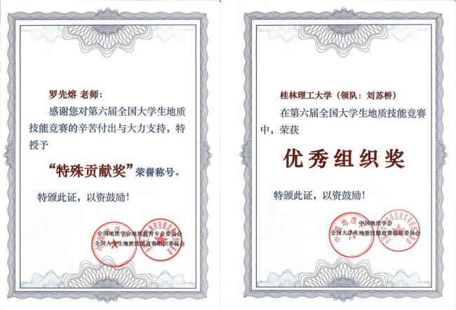 2022年5月12-20日,由中国地质学会主办、中国地质学会地质教育研究分会和成都理工大学共同承办的第六届全国大学生地质技能竞赛首次通过线上线下相结合的方式举行,最终产生地质技能综合应用、野外地质技能、地质标本鉴定、地学知识等四类单项奖,以及团体奖、优秀指导教师奖、优秀组织奖、优秀志愿者、特殊贡献奖等9个类别的奖项。经过激烈角逐,我校代表队分别荣获野外地质技能二等奖、地质标本鉴定二等奖,罗先熔老师荣获特别贡献奖,学校荣获优秀组织奖。