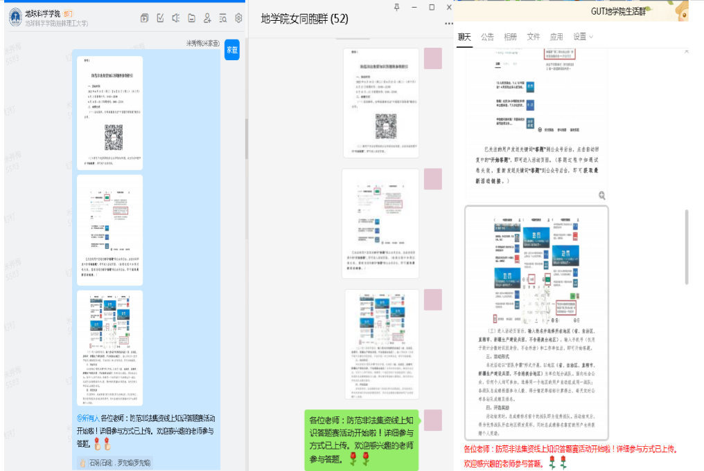 6月15日上午,“防范非法集资”线上竞赛活动开始。学院党政办公室老师在学院工作钉钉群、QQ群和微信群等多渠道宣传线上参赛指引,老师们热烈响应、积极参与。