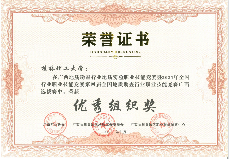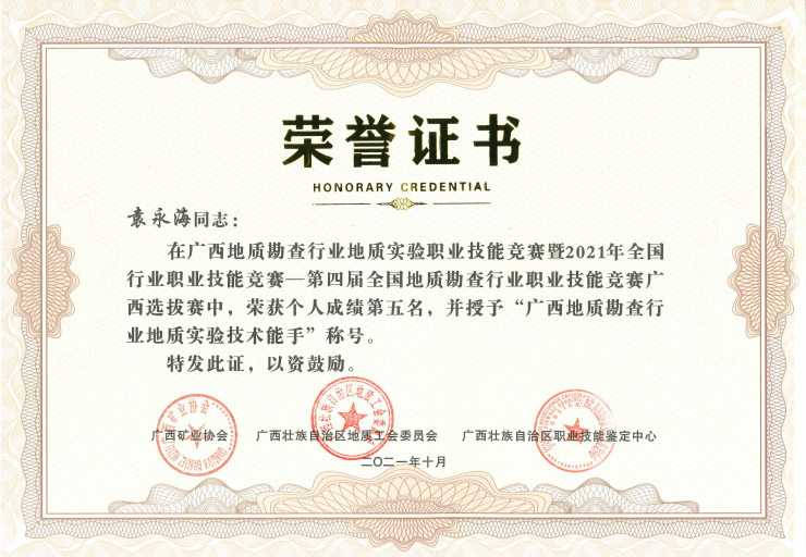 2021年10月23日,由广西矿业协会、广西地质工会、广西职业技能鉴定中心共同举办的广西地质勘查行业地质实验职业技能竞赛暨2021年全国行业职业技能竞赛—第四届全国地质勘查行业职业技能竞赛广西选拔赛落下帷幕,来自全区8家单位共24名选手参加了理论考试和实际操作的比赛。2138CC太阳集团实验室三位教师组队参赛。经过两天激烈角逐,袁永海老师荣获个人成绩第五名,并被授予“广西地质勘查行业地质实验技术能手”称号;学校荣获优秀组织奖。