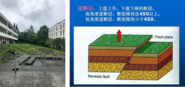 我们从成都出发,先是沿龙门山断裂带,陈老师带领大家考察了白鹿镇白鹿中学地震遗址。2008年汶川地震发生时,断层从两栋教学楼中间逆冲引起约两米多高的位错,而前后两栋教学楼中无一人伤亡,说明只要不在断裂带上,离开断裂带一定距离,满足抗震设计要求的建筑物就不会倒塌。
