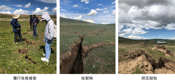 这次地震在海拔4200~4600m 的高原面上形成了一系列由张裂隙、张剪裂隙、剪切裂隙、挤压鼓包和裂陷等多类型破裂组合而成的复杂同震地表破裂带,全长约160km。破裂带不完全连续,各段破裂走向及阶区特征也不完全一致,我们在这里花了一周时间,每天早出晚归,追着破裂带跑。很多地方也没有路,这里要感谢我们的司机师傅们对这一带地震情况的熟悉及跋山涉水开车的高超技术。