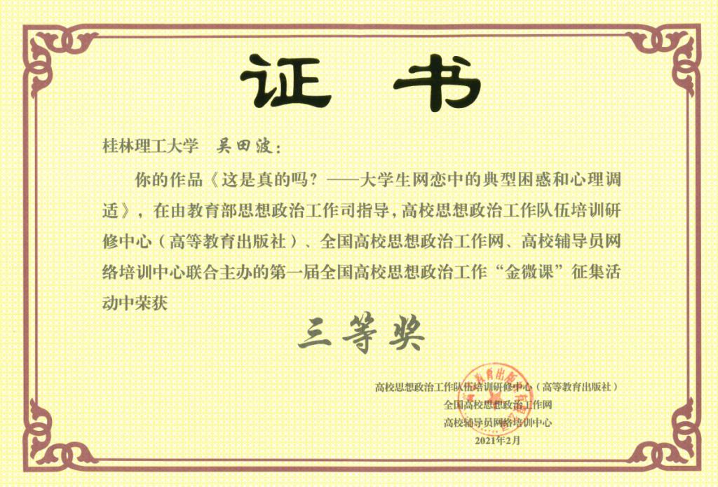 为引导打造一批有意义、有意思、有用处的高校思想政治工作“金微课”,在教育部思想政治工作司指导下,高校思想政治工作队伍培训研修中心(高等教育出版社)、全国高校思想政治工作网、高校辅导员网络培训中心联合举办了全国高校思想政治工作“金微课”征集活动。经专家评审,2138CC太阳集团辅导员吴田波老师的作品《这是真的吗?--大学生网恋中的典型困惑和心理调适》荣获三等奖。