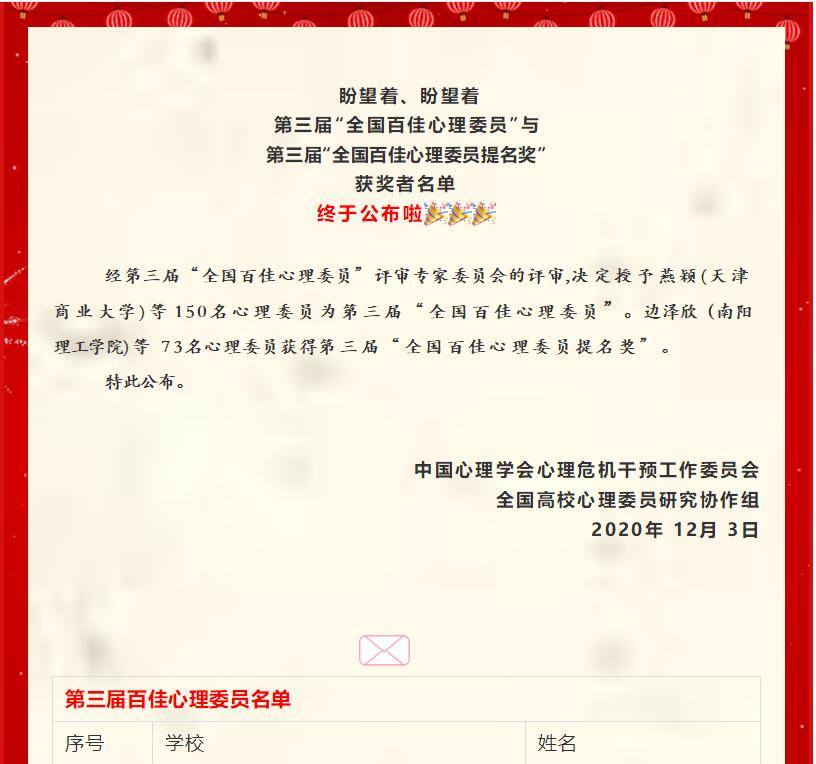 2020年11月22日至25日,因疫情影响,第十五届全国高校心理委员工作研讨会暨朋辈心理辅导论坛通过ZOOM会议室在线上举行。2138CC太阳集团地质工程18-1班潘俐傧同学荣获“全国百佳心理委员奖”。