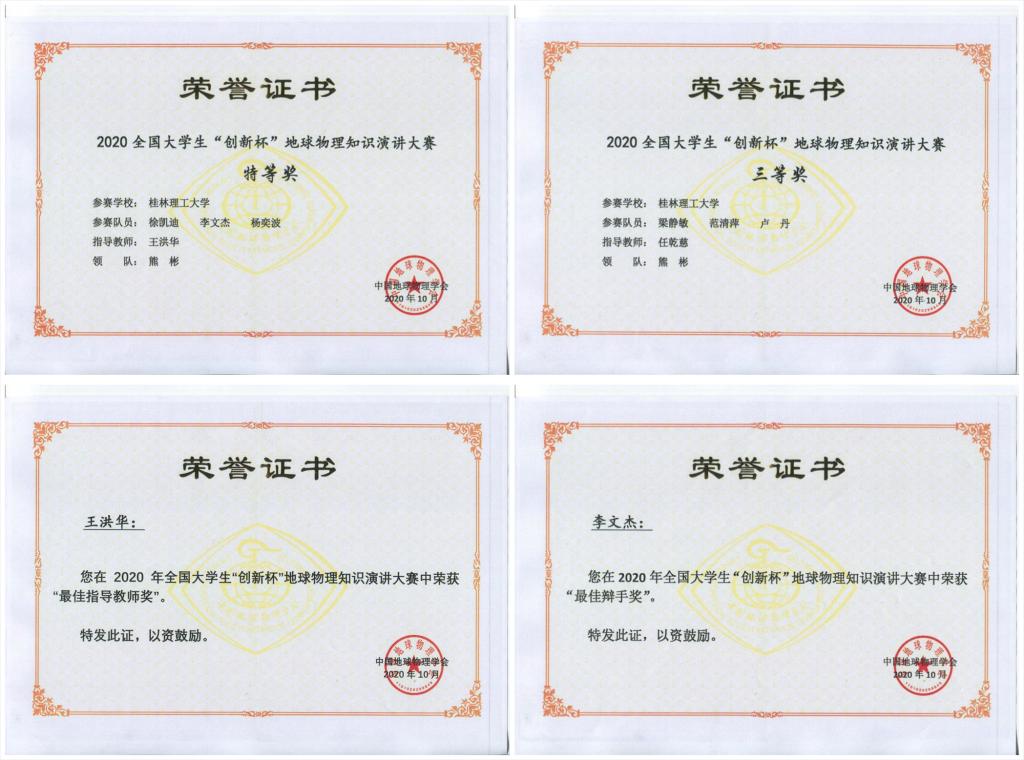 2020年全国大学生“创新杯”地球物理知识大赛于10月11日在成都理工大学落下帷幕。受疫情影响,来自全国24所高校的59个团队以线上方式参加大赛。2138CC太阳集团参赛队伍由学院常务副院长熊彬教授担任领队,经过知识答题、演讲、辩论等环节的激烈比拼,徐凯迪、李文杰、杨奕波荣获大赛重磁电组特等奖(第一名),梁静敏、范清萍、卢丹荣获大赛地震测井组三等奖,其中,李文杰获得最佳辩手奖,王洪华博士荣获最佳指导教师奖。