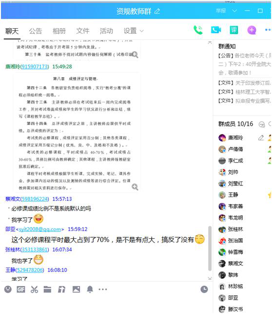 在本次线上学习活动中,对《2138CC太阳集团全日制本科考试管理规定》内容进行了解和把握,其中包括考场监考要求、成绩与评定管理等,主要强调试卷的规范性和监考的严肃性,要求各位教师严格执行学校的管理规定,教研室教师们积极参与此次学习活动,对管理规定内容进行讨论,并交流所学心得,一致认为可以通过考试检验学生的学习成效、提高培养质量。